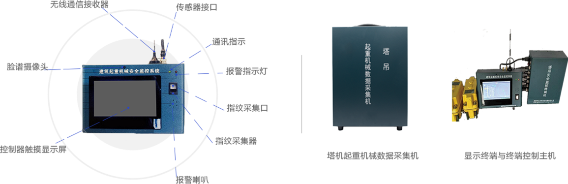 監(jiān)控尺寸為25×20×8.5(cm),接收數(shù)據(jù)采集器數(shù)字信號之后進(jìn)行相應(yīng)的處理。最終將塔吊的工作狀態(tài)生動顯示在7寸顯示屏上,并且終端所有操作均通過觸摸完成。終端可以采集塔吊、升降機(jī)操作人員的指紋信息,并能與監(jiān)控平臺備案的指紋數(shù)據(jù)對比,確定操作人員的身份,為進(jìn)一步完善操作人員的管理奠定了基礎(chǔ)。針對塔吊駕駛員考勤定時拍照,確定是否為本塔吊駕駛員操作,可以不定時的進(jìn)行遠(yuǎn)程巡檢,避免其他非認(rèn)證駕駛員違規(guī)操作。